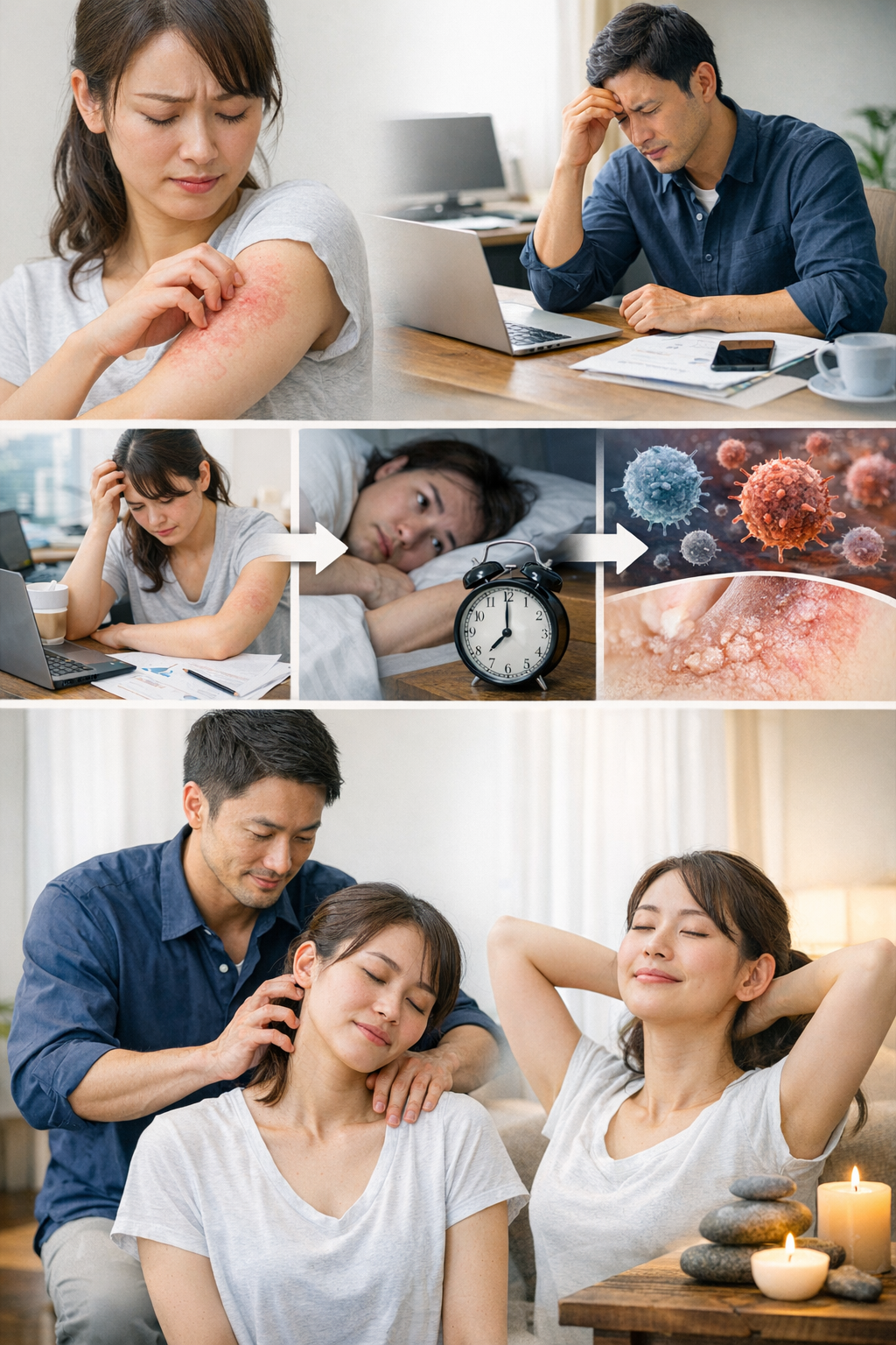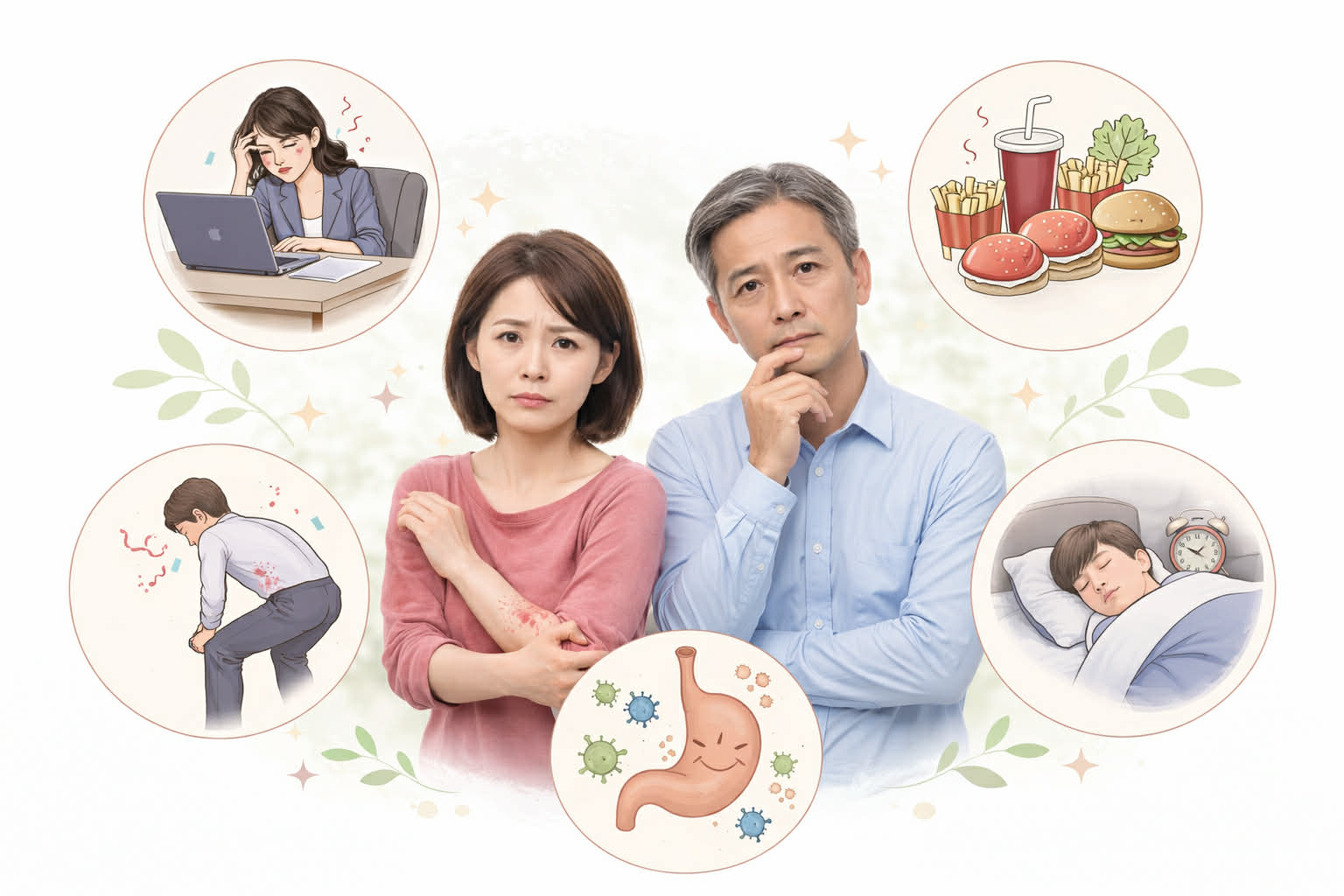【アトピーが中年以降に悪化する要因】 更新日:2026年4月1日 公開日:2026年3月25日 アトピー性皮膚炎自律神経系 アトピーは「子どもの頃の病気」というイメージを持たれがちですが、実際には中年以降に再発したり、悪化したりするケースも少なくありません。 特に仕事や家庭のストレスが増える年代に差し掛かることで、体質の変化とともに症状が強 […] 続きを読む